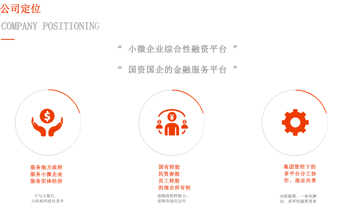 堅持“服務地方政府、服務小微企業、服務實體經濟”的方向, 不與大銀行、大機構同質化競爭;通過國有控股(相對)、民資 參股、員工持股的混合所有制,心懷小微,頭戴紅帽,走市場化 道路;通過集團管控下的多平臺分工協作、混業共享,實現風險 隔離,一體化解決中小企業多樣性融資需求。